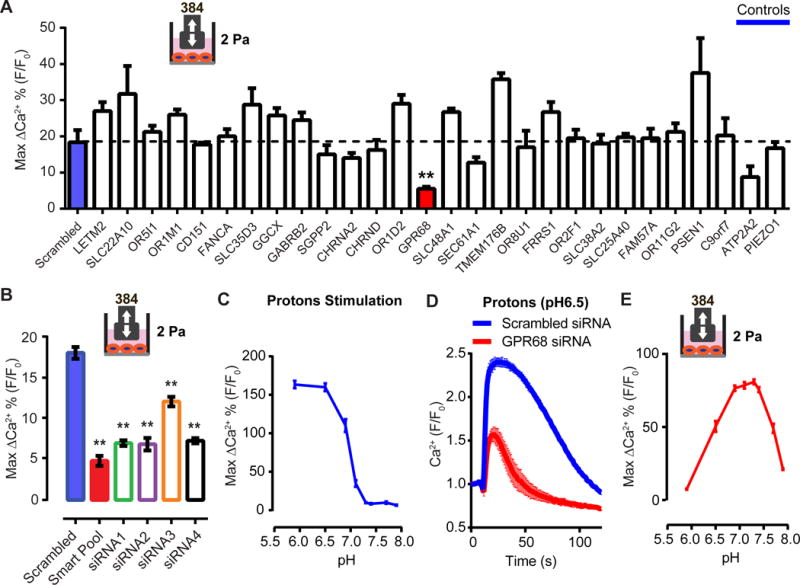 最终研究人员确定了 GPR68 基因,该基因敲低会导致细胞对剪切应力响应程度下降。 GPR68 被描述为质子激活的 GPCR,实验结果也表明 MDA-MB-231 细胞在 pH 值 7.4-6.9 时(正常动脉血 pH 值约为 7.4,6.9 代表严重酸中毒)对剪切应力响应最敏感,表明 GPR68 确实需要质子的存在才能感知剪切应力。