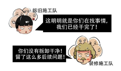 这里说的责任归属指的是拆旧施工队和装修公司之间的对接,这种问题往往出现于业主自己找拆旧施工队来进行打拆,打拆完以后再找装修公司来接手,这往往会涉及两个施工队,这就导致出现一个问题,如果选择了不同的施工队,那就容易出现推卸责任(像下面的情况),所以我们建议大家尽量选择一个施工队来施工。