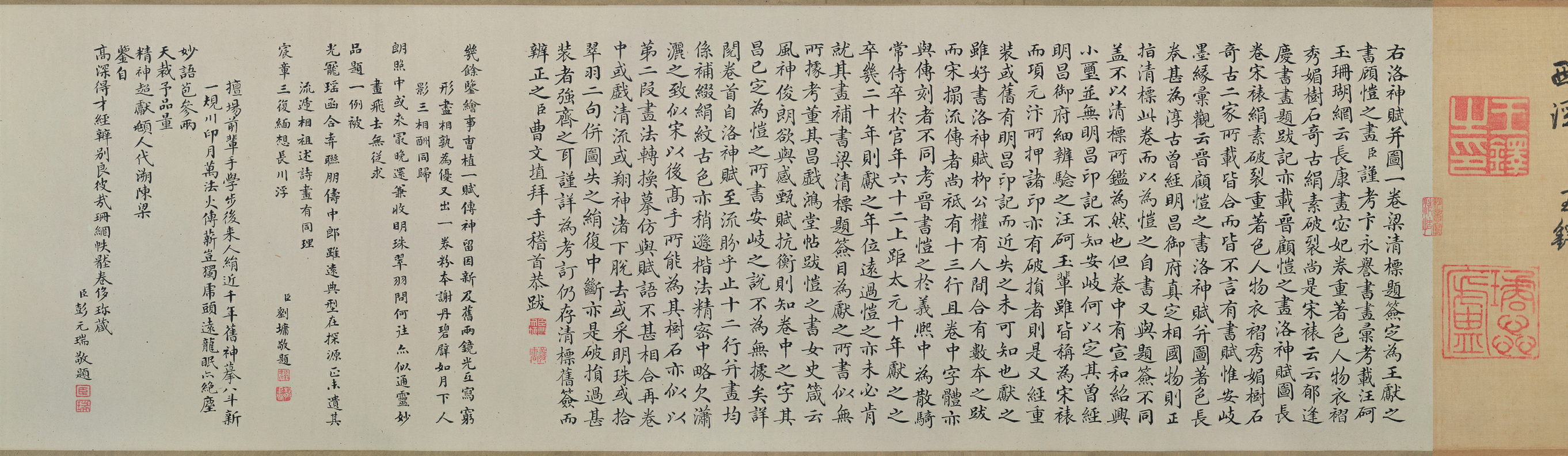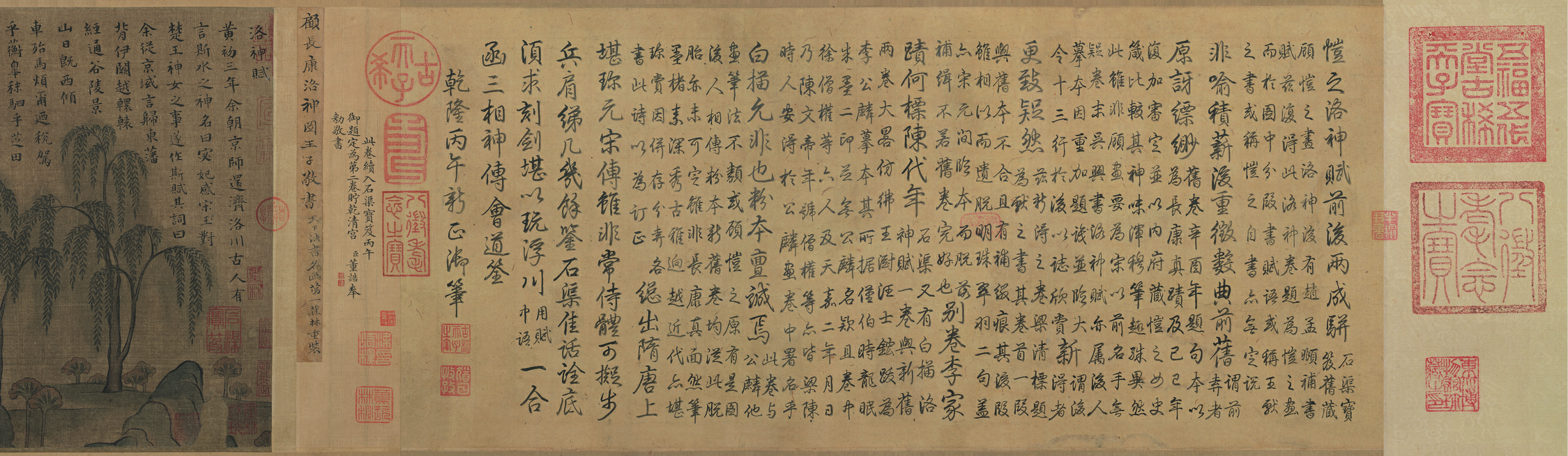 画心无作者款印,清初梁清标旧题签称此卷为“顾长康洛神图王子敬书”,将此卷与传为顾恺之的其他洛神图相比较,经近人研究认为此卷或为北宋人所摹,文字亦为宋人所书。此卷流传有序,卷中所钤历代鉴藏印记八十方。北宋、南宋时庋藏于内府,有宣和、绍兴连珠印可证。明嘉靖时为福建上饶人叶钶所有,明末为河南睢州人袁枢(袁可立子)收藏,卷中钤有袁枢的多方鉴藏印记。之后转为项元汴收藏,明未清初一度为袁枢的亲友王铎所藏,后转归梁清标之手。乾隆时入藏清内府,有乾隆、嘉庆、宣统内府鉴藏印,引首有乾隆行书诗题,前隔水有清董浩题记。卷后由清王铎、曹文址、刘墉、彭元瑞等题跋。末代皇帝溥仪逊位之后,以赏赐其弟溥杰的名义将其携出清宫,经天津运往长春伪皇宫。抗战胜利后,溥仪将其携至吉林通化大栗子沟,被东北抗日联军收缴,经东北银行转交东北文物管理委员会,其后入藏东北博物馆,即现在的辽宁省博物馆。