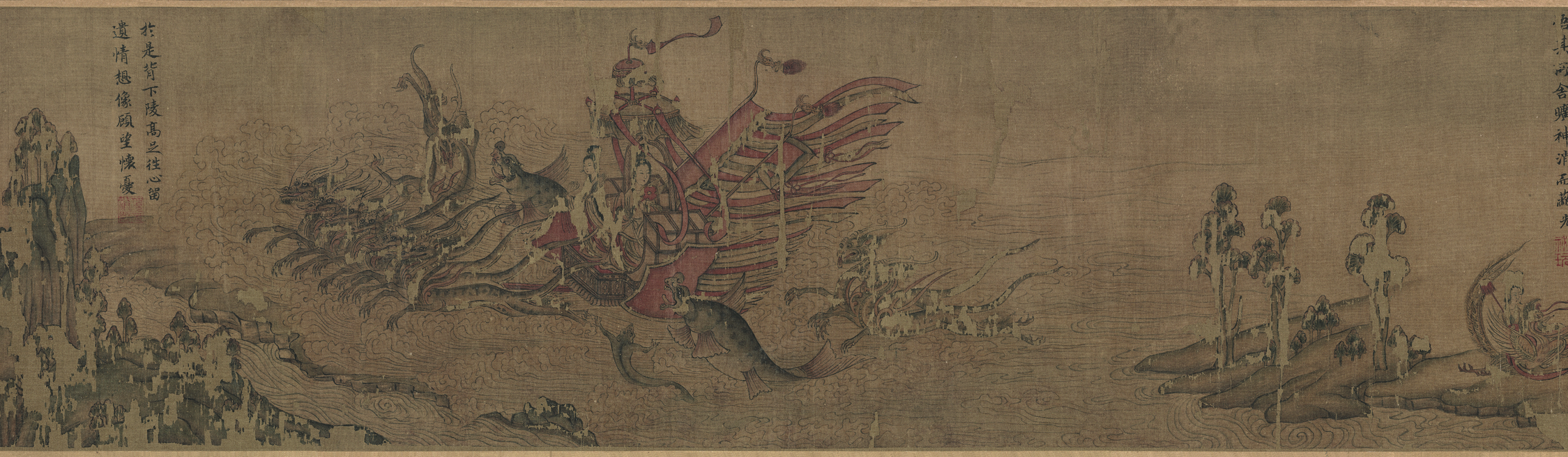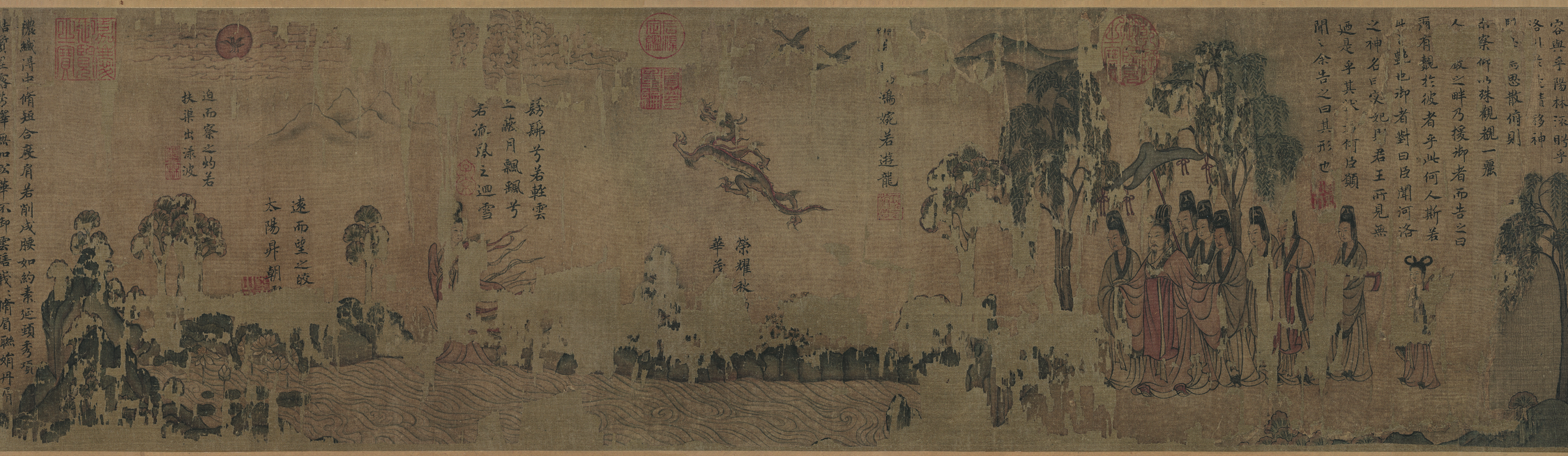 <洛神赋图>为中国东晋绘画作品,作者顾恺之。原作已佚,今存有宋代摹本6卷,除我国台北“故宫博物院”所藏一件为册页外,其余五件(故宫博物院藏三卷、美国弗利尔美术馆藏一卷及本卷)构图、内容与造型基本一致,均为宋人摹本,唯技法工拙不一。辽博收藏这件<摹顾恺之洛神赋图卷>是现存宋摹本中最完整、最古朴的一件,是顾恺之绘画的重要传世摹本。