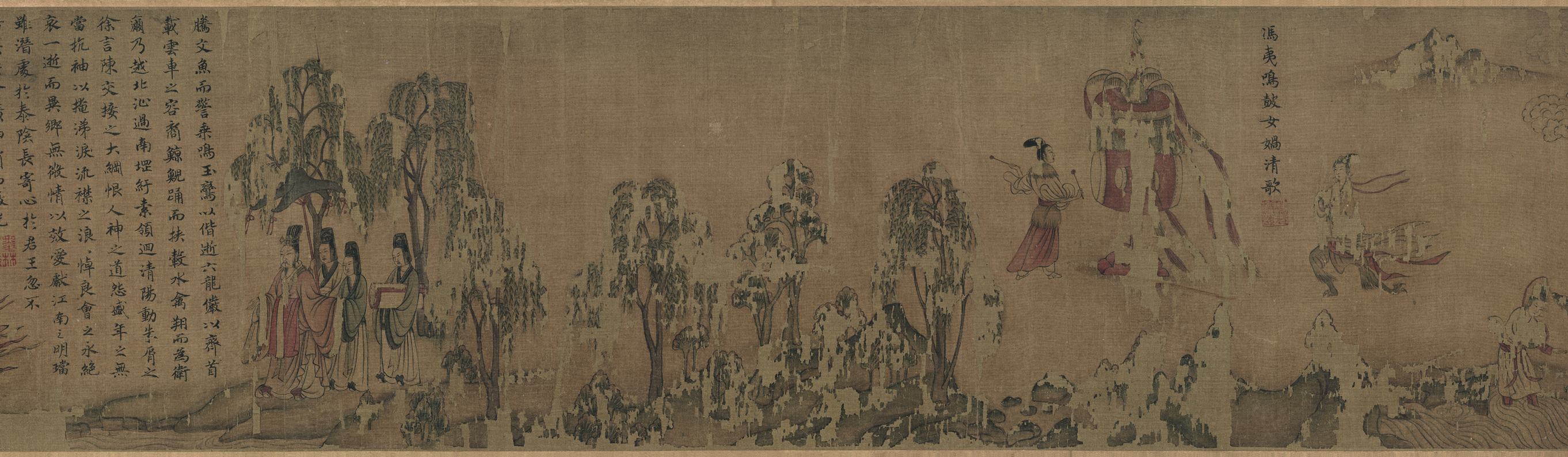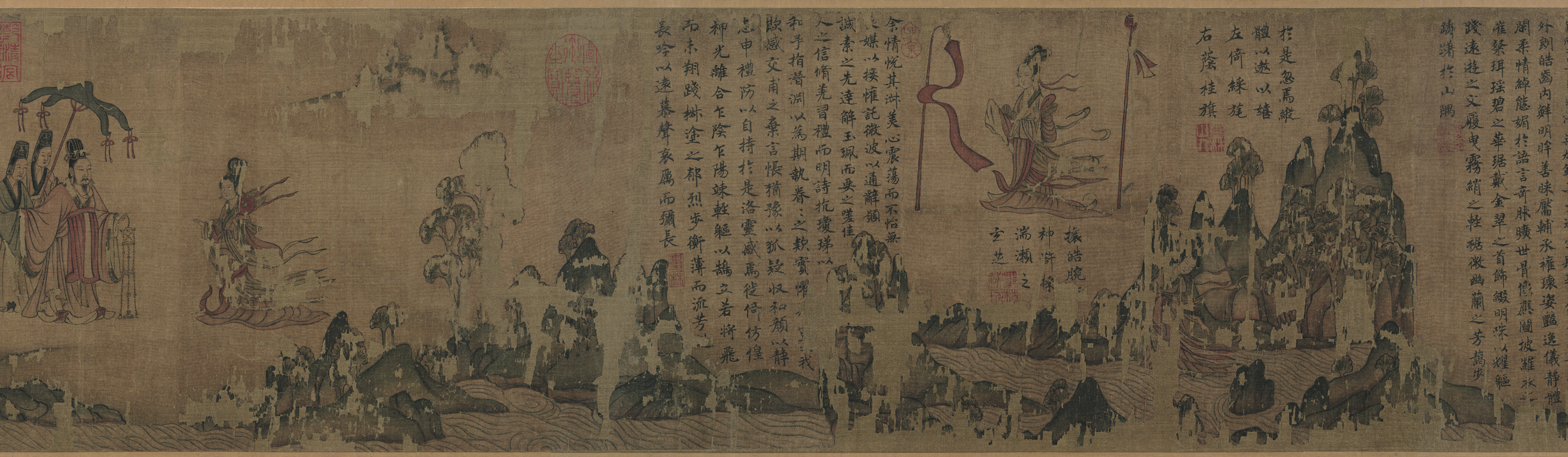 原作是根据三国曹植的抒情名篇<洛神赋>为依托而创作的连环画,是传世中国画中以文学为题材的最早作品之一。该图描绘了作者对洛水之神宓妃的爱慕以及神人殊隔、不能交接的惆怅。作品将不同情节置于同一画卷,洛神和曹植在一个完整的画面的不同场景中反复出现,以山石、林木及河水等背景,将画面分隔成不同情节,使画面既分隔又相联接。卷中人物、山水、树石、龙马等,一应俱全,刻画细致。人物用笔古拙,山石空勾无皴,画风高古,上接魏晋。依画面内容,又将<洛神赋>全文以小楷书分二十二段录于其上。画卷起首处本残,为后人所补。