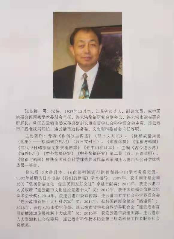 张良群先生:江苏省沛县人,徐福会顾问兼学术委员会主任、连云港徐福研究会副会长