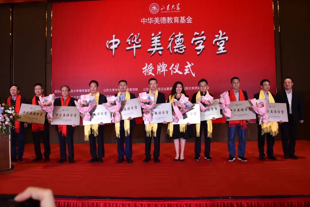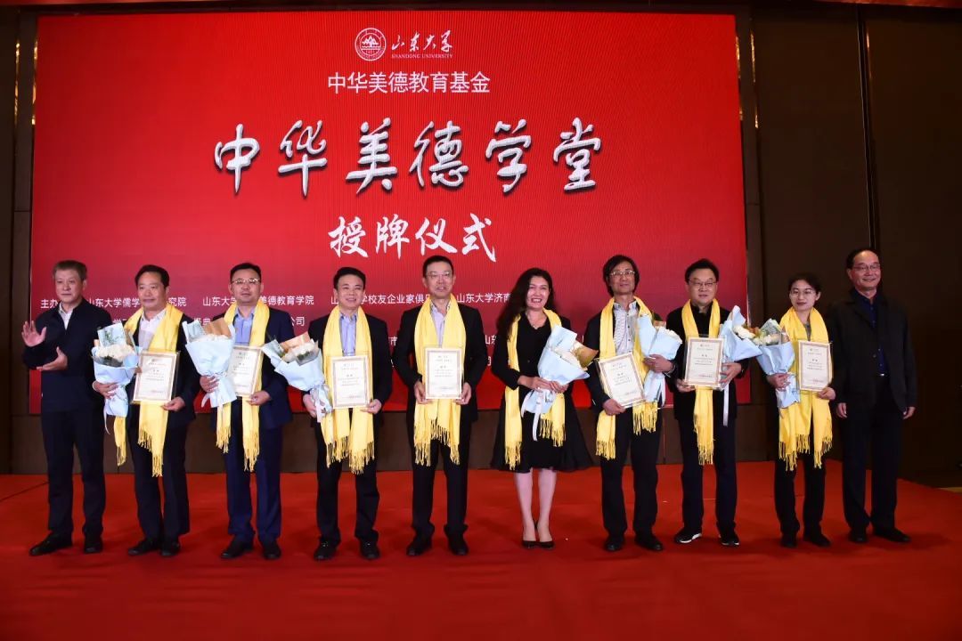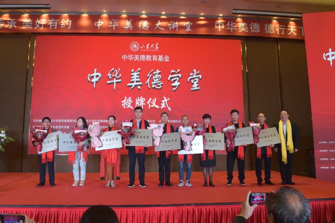 山东大学儒学高等研究院执行院长、中华美德教育学院院长王学典,济南市政协副主席、济南市工商联主席刘梦海为首批获准设立山东大学中华美德学堂的企业授牌。这些企业和企业负责人是:银丰投资集团董事长王伟、保龄宝生物股份创始人刘宗利、漱玉平民大药房股份董事长李文杰、盛和招标公司董事长侯艳丽、政和科技股份董事长朱涛、煜德电子技术董事长王德霞、秦工国际集团董事长秦长岭、华天科技集团总裁杨为清、新城控股山东公司代表蔡春吉、《文史哲》阅读馆、山东开瑞文化发展公司董事长焦念国、山东安和乐利科技公司总工程师张希元、沃尔德集团、山东迈瑞医疗集团董事长徐大福、山东齐剑健康管理咨询公司董事长刘明素、济南在亲民教育咨询公司董事长陈志强、山东天赋教育科技公司董事长谭永平、 山东金晔农法食品公司董事长李金伦、山东大学青岛校友会副会长侯艳丽、潍坊中和元文化发展公司总经理魏子凯、潍坊好德国学院院长李芳、威海荣和健康科技公司董事长范昕、上海舜德艺术文化发展公司总经理高芳。