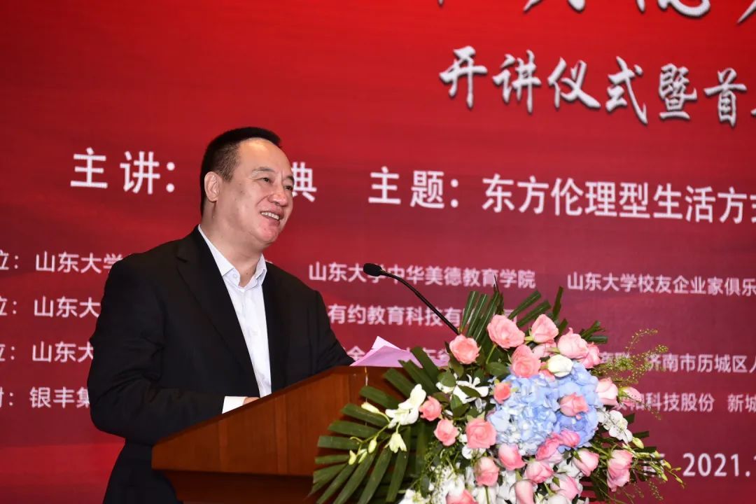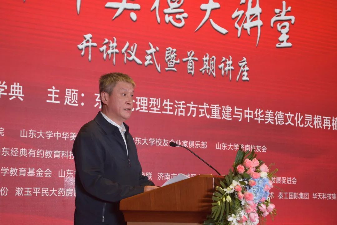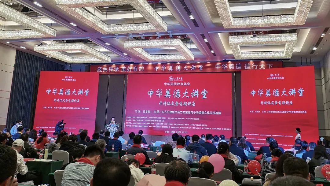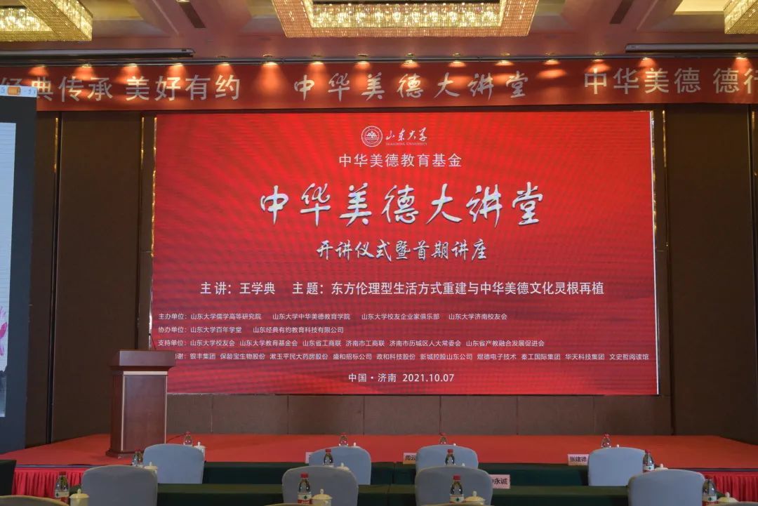 金秋十月,丹桂飘香。由山东大学儒学高等研究院、山东大学中华美德教育学院、山东大学校友企业家俱乐部、山东大学济南校友会联合举办的山东大学《中华美德大讲堂》开讲仪式暨首期讲座,于2021年10月7日在济南美丽的银丰华美达酒店隆重举行。