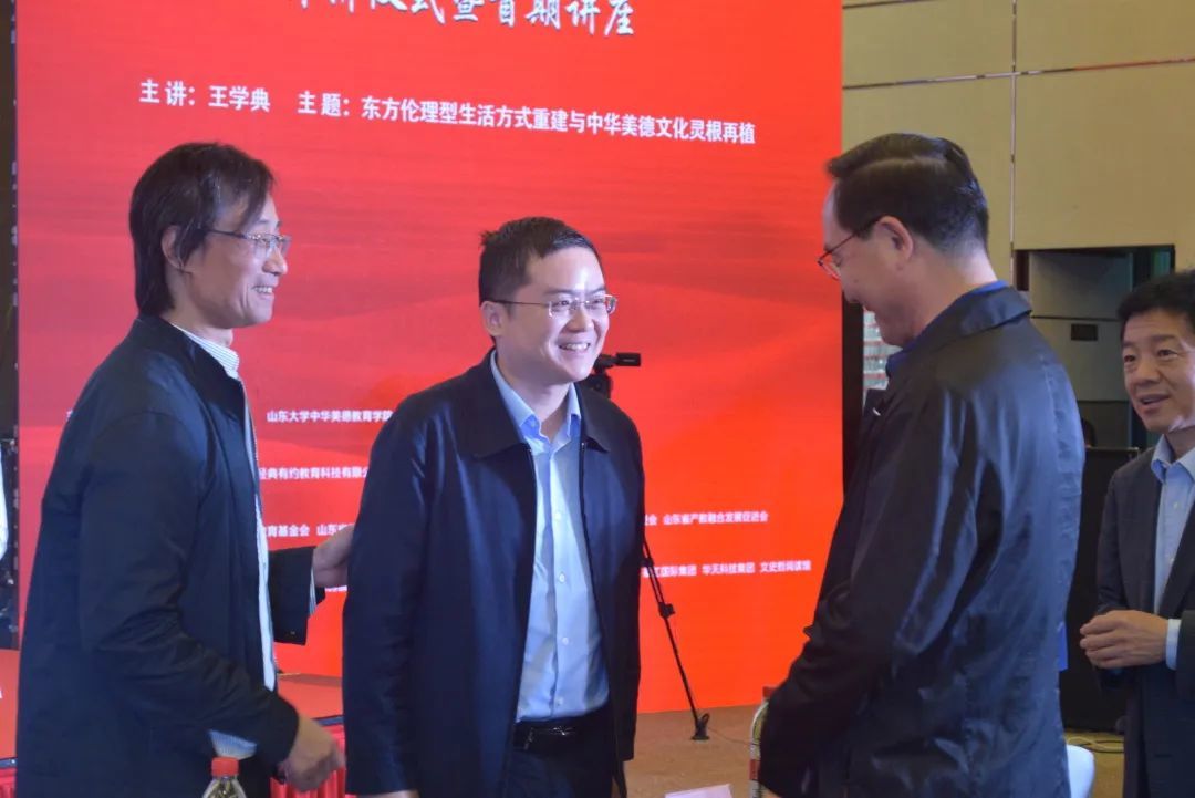 山东大学常务副校长王琪珑,山东大学儒学高等研究院执行院长王学典,山东大学儒学高等研究院党委书记、山东大学中华美德教育学院党委书记李平生,山东大学国际创新转化学院院长、山东大学继续教育学院院长陈志军,山东省委统战部副部长、省工商联党组书记、常务副主席周云平,山东省水利厅一级巡视员张建德,济南市工商联主席刘梦海,省国资委张志波,尼山世界儒学中心党委委员、中国孔子基金会副秘书长、孔子学堂推广委员会主任周静,历城区人大常委会主任孙德顺,银丰集团董事长王伟,山东华天科技集团董事长李宇兵等12位领导嘉宾上台与现场全体嘉宾共同发出“经典传承、美好有约,中华美德、德行天下,山东大学中华美德大讲堂,开…讲…啦…”的响亮口号,山东大学中华美德学堂正式启动!