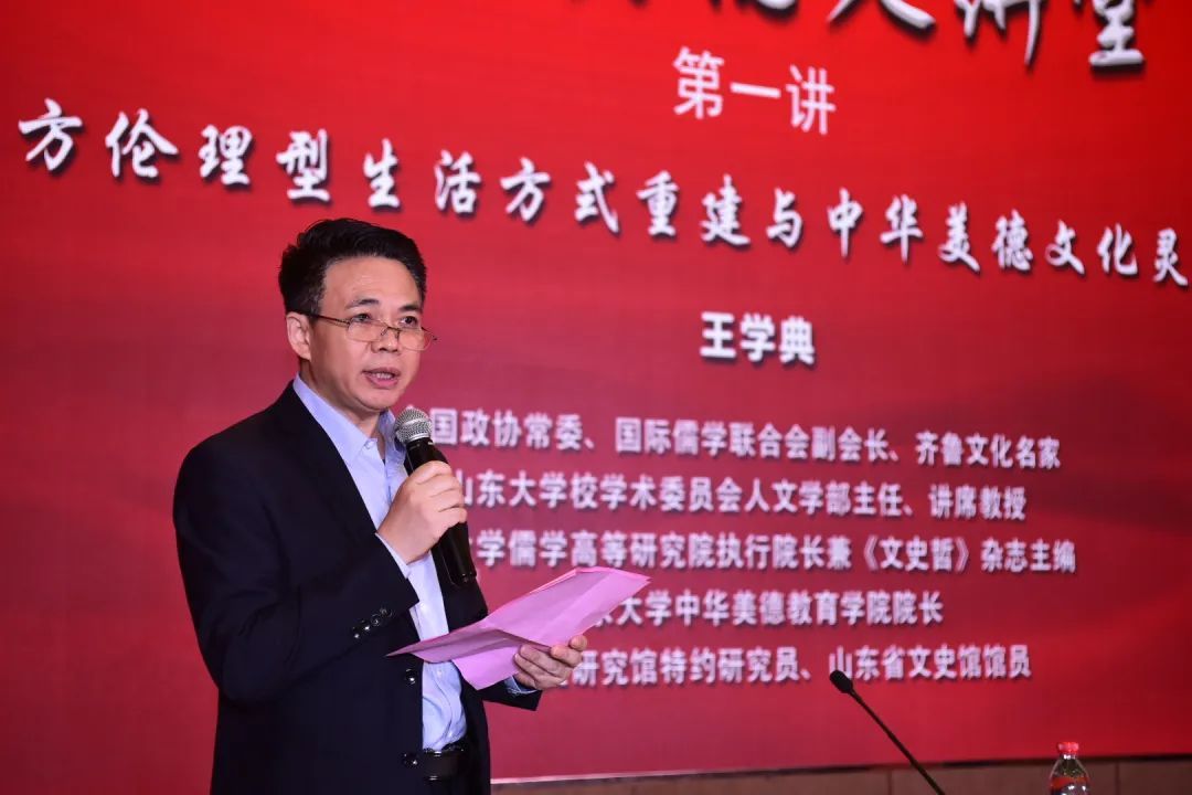 上午十点二十分,开始了山东大学中华美德大讲堂的首期讲座。全国政协常委、国际儒学联合会副会长、齐鲁文化名家、山东大学校学术委员会人文学部主任、讲席教授、山东大学儒学高等研究院执行院长兼《文史哲》杂志主编、山东大学中华美德教育学院院长、中央文史研究馆特约研究员、山东省文史馆馆员王学典先生,作了《东方伦理型生活方式重建与中华美德文化灵根再植》的主题分享,使在场的听众对中国优秀传统文化的魅力有了进一步的感受和领会。