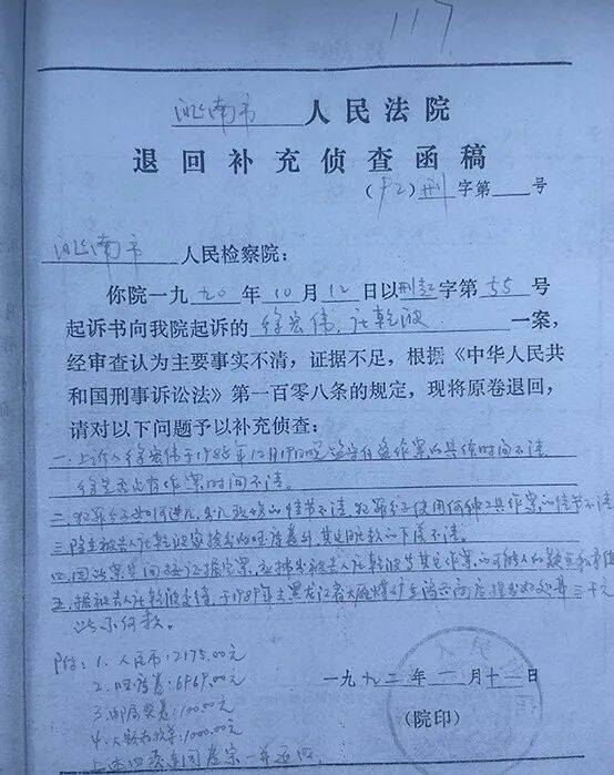 ▲1992年1月11日,洮南市人民法院作出的退回补充侦查函稿。受访者供图