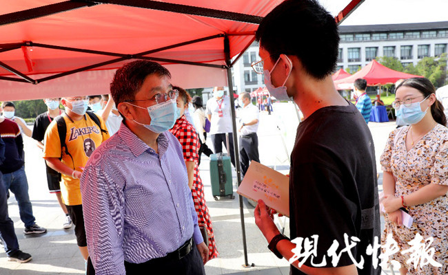 9日上午,苏州大学党委书记江涌一早来到阳澄湖校区,了解迎新保障工作和新生报到情况,慰问参加迎新工作的师生志愿者们。当天,恰逢机电工程学院新生蔡翱骏的生日,学院为他精心准备了一份暖心礼物——朱光潜先生撰写的《给青年的十二封信》一书。江涌现场为蔡翱骏送上生日祝福,并在新书扉页上题写了亲笔祝福。“初入大学,我是不安与紧张的,但学校的安排、江书记的鼓励让我感受到了苏大的人文关怀,倍感惊喜、倍受激励。”蔡翱骏说,在以后的学习生活中,他会更加努力,不辜负各位老师的期待。