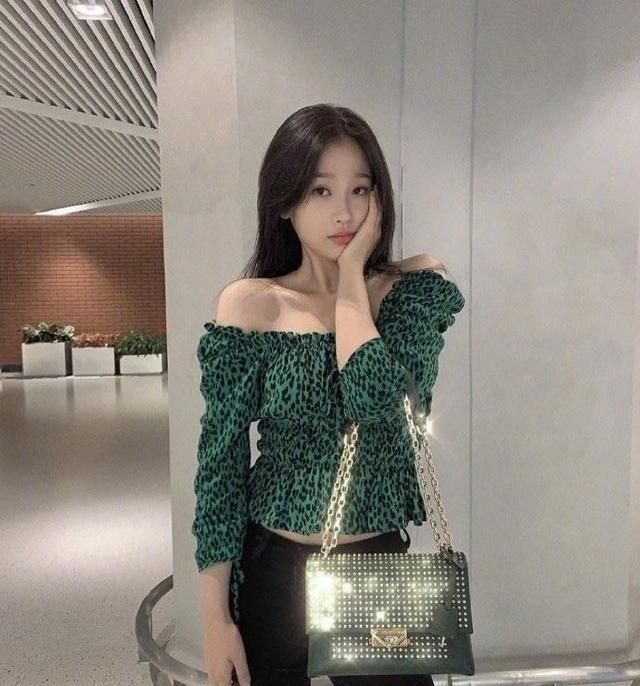 一字肩的独特设计让肩膀显得更加薄,深绿色有一种大自然的亲切之感,本身虞书欣的个人品味就蛮不错,豹纹的神奇纹路能够将这种微张扬的款式与风格发挥到淋漓尽致。腰间微微收紧,褶皱感很强的压缩印花设计也将这种身材上的优势无限放大,并且露出很纤细的小蛮腰。这种看起来就俏皮灵动、活泼开朗的服装真的是超级适合虞书欣这位小作精呢
