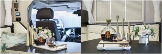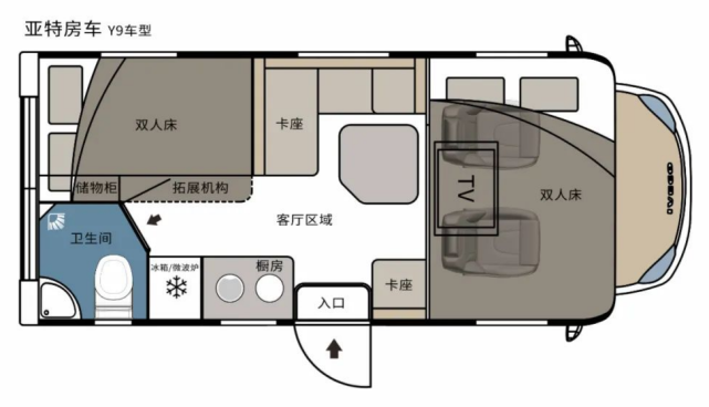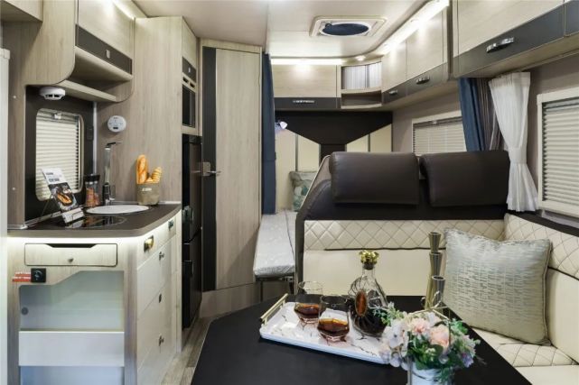 车内空间布局从右至左依次为:驾驶区、额头休息区、会客区、厨房区、尾部睡卧区、卫浴区;