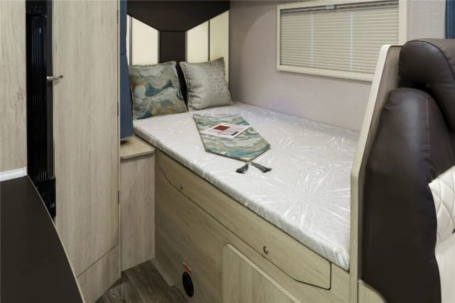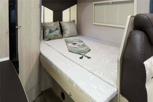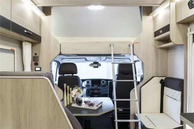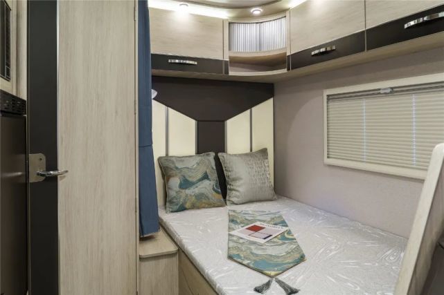 额头部分的双人床尺寸为2300x1400mm,内部空间充足,配有高端亲肤布艺床垫,可满足多人舒适睡眠的需求;双人床两侧分别设有外推窗(带隔断帘),加强内部采光通风;内部阅读灯、电源插座方便夜间休息时使用;同时支持选装合世壁双层保温全景天窗;