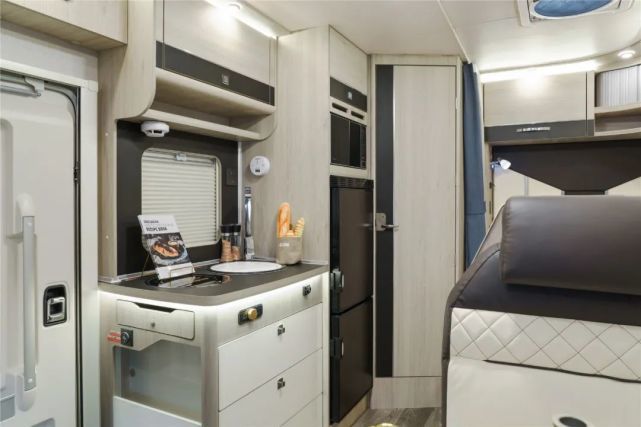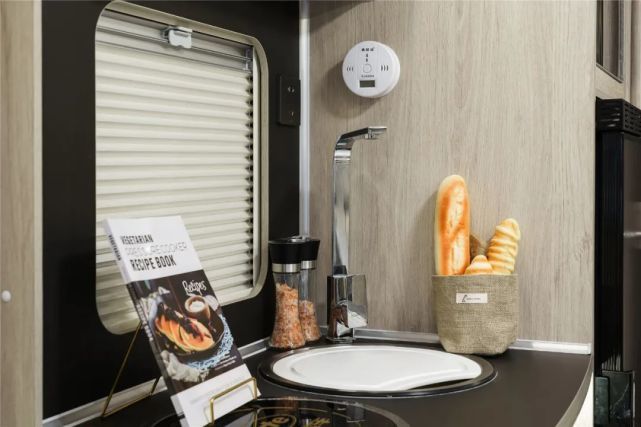内部配置了房车专用电磁炉(1200W)、高档不锈钢洗菜池(带移动盖,可当做菜板)、高档房车专用水龙头等设施,日常车内烹饪没有压力,同时支持加装房车专用抽油烟机,有效减少做饭时车内油烟泛滥的问题;