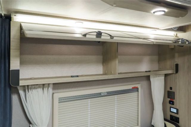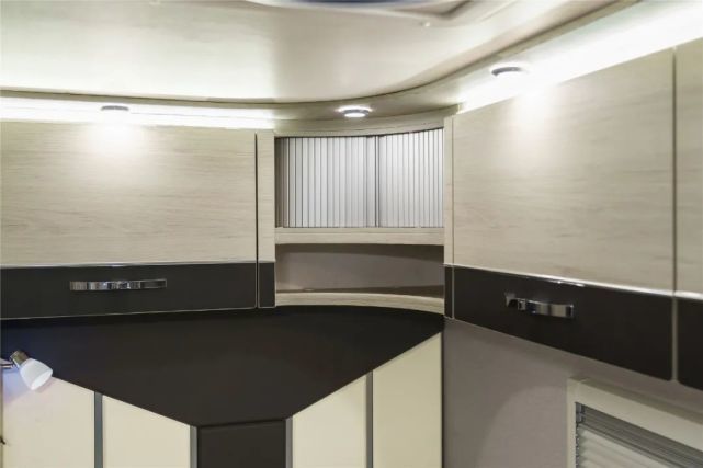 上方是多组储物吊柜,储物空间丰富;顶部LED灯进一步加强内部照明;