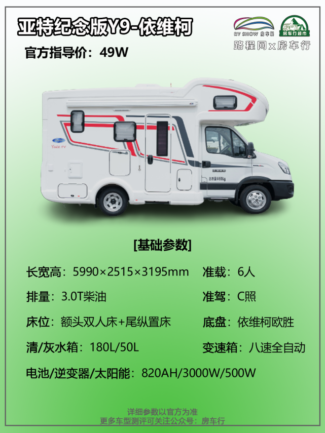 水电方面,亚特纪念版-Y9-依维柯版本标配了180L清水箱、50L灰水箱、12V820Ah磷酸铁锂电池、3000W充电逆变一体机、500W如果新能源太阳能电池板+太阳能控制器、150A+150A双发电机等设施;目前,新车官方指导价49W,综合实力不错,性价比很高,喜欢的朋友不妨考虑一下!