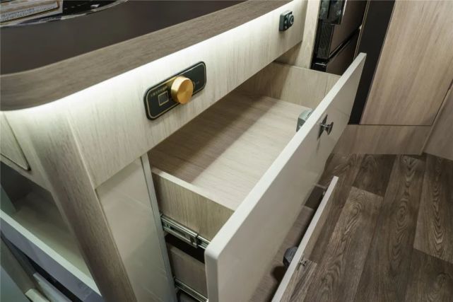 生活舱的内饰提供了白栎木、瑞士深灰等多种风格可供选择;内部空间通透,各功能区规划合理,并采用环保木质组合家具、进口防火地板革进一步提升旅居舒适度;上方吸顶式暖光主照明灯、天池灯、氛围灯保障内部采光充足;顶部标配房车专用10速双向防雨换气扇,进一步加强车内空气循环;