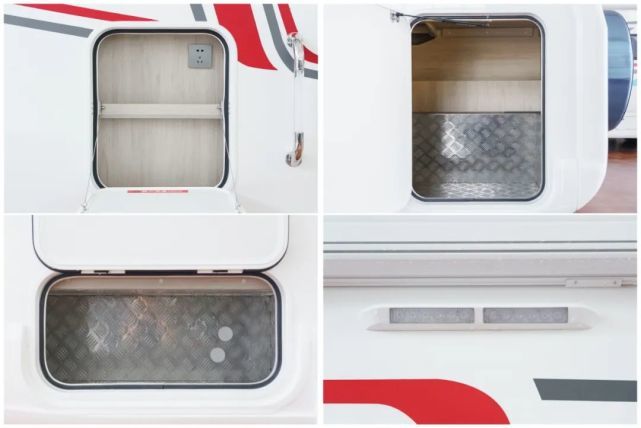 车身外部配备了房车专用手动遮阳棚、电动上车踏步、主副驾驶舱门上车踏板、外置行李舱、户外照明灯、上车扶手、外接重力注水口、外部取水口(带快接花洒)、抽拉柴油灶、市电接口、外接电源充电口(配10米电源线)、房车专用驻车支腿(选装)等设施,便于驻车时户外生活使用;