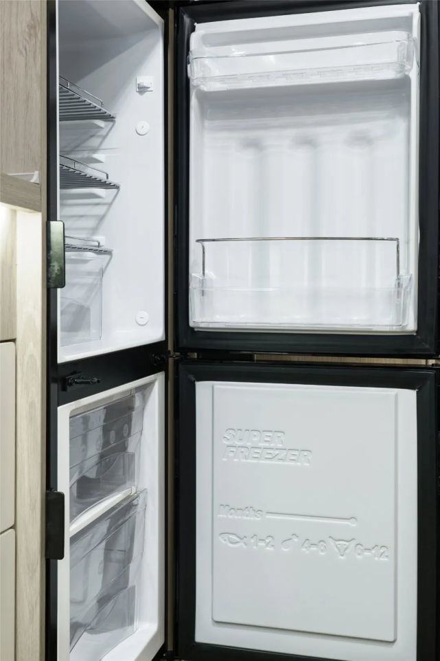 与厨房区搭配的还有一台房车专用弗罗斯特车载冰箱,双开门,148L的大容量,充分满足长途旅行储存大量食材的需求;另外支持选装英得尔(indel B)车载专用冰箱76Lx2(共152L);