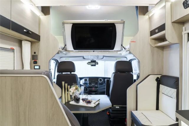 驾驶舱与后方生活区贯通式设计有效避免频繁上下车;过道上方是一台房车专用32寸车载智能电视,搭配车载音响套装(双扬声器),可为你的旅行提供全方位的观影娱乐体验;