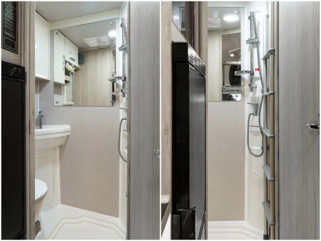 整体式卫生间内部配备了集成式卫浴系统,包含高亮浴室镜、房车专用洗漱池、双向换气扇、进口多美达抽拉盒式马桶(黑水箱 18L)、独立淋浴花洒、毛巾架等;