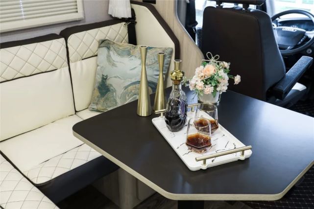 会客区的L型卡座采用高档皮质沙发,乘坐舒适度大幅提升,同时配有安全带方便行车时载人;中间搭载一张可升降式餐桌,便于车上人员日常餐饮娱乐;