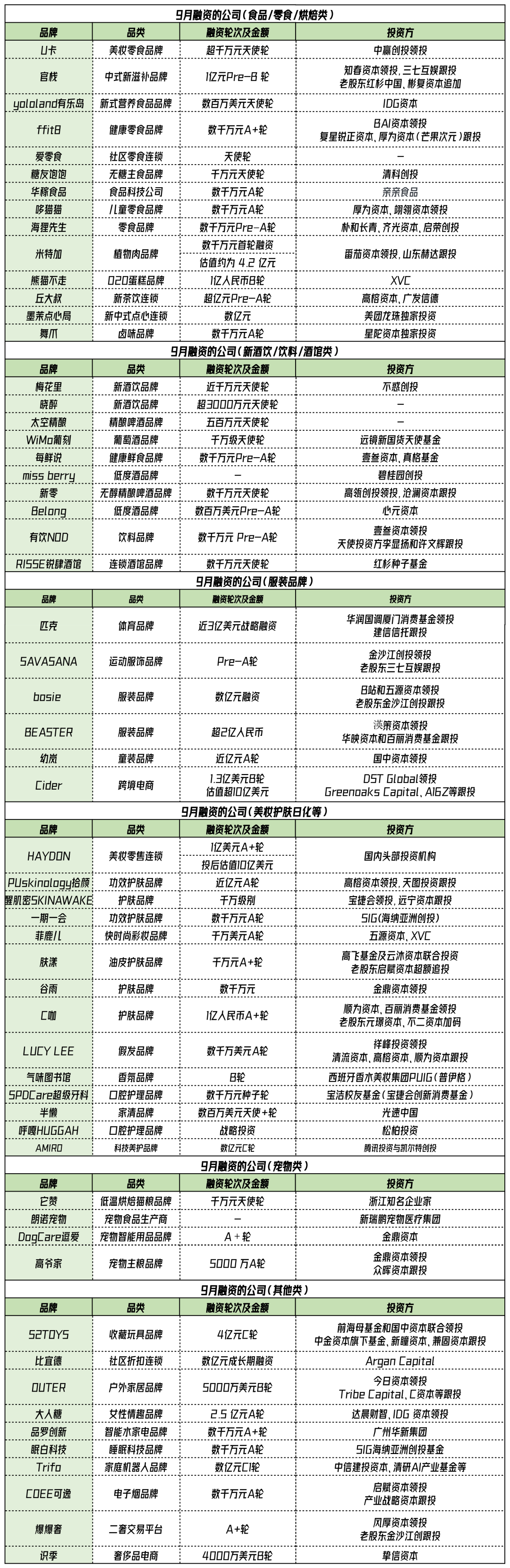 过去的九月,消费行业一级市场的融资仍旧活跃。据我们的不完全统计,60多个项目拿到了融资,美妆护肤、低度酒、茶饮、零食、消费电子,以及新一代零售品牌仍旧是其中最为活跃的赛道,其中最大规模的一笔融资是体育品牌匹克,获得国资背景的华润领投的3亿美元投资。