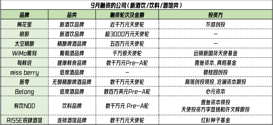 整个九月,依然有包括Miss Berry、Belong、梅花里、晓醉等低度酒品牌,以及太空精酿和新零等精酿啤酒品牌拿到融资。