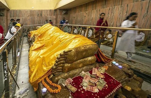 拘尸那迦为释迦牟尼圆寂地,位于印度北方邦哥达拉克浦县凯西以北约2.5公里的摩达孔瓦尔镇。佛教徒尊该地为佛陀涅槃地。(古印度佛教遗址传为释迦牟尼涅槃处。)古印度末罗国的都城。在今印度北方邦哥拉克浦县凯西郊外,名“摩达孔瓦尔”(意为“死王子”)。1853年,英国学者发掘了这一遗址。现存主要文物有约在5 世纪雕刻的释迦牟尼涅槃像(1833年发现),侧身卧于石榻之上;像与榻系一块整石刻成,并刻有阿难等弟子像和铭文。现该像保存在新建的大涅槃堂内。另有大涅槃塔、安伽罗塔等。现今常常可以看到身穿红色僧袍的出家人坐在台阶上接受信众供养以及一袭白衣的信众聚集念经的场景。