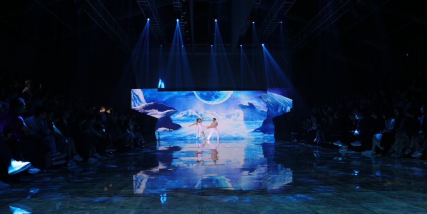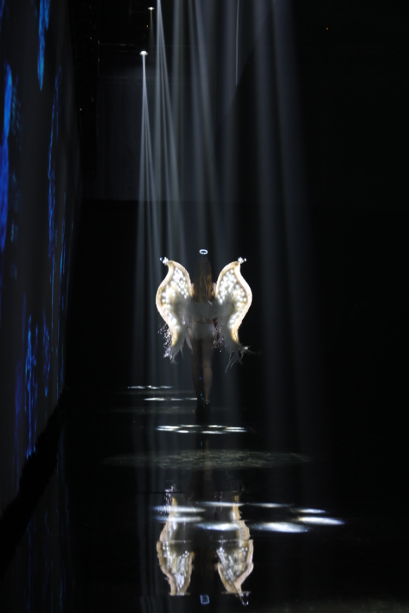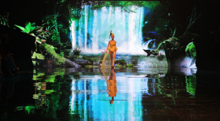 由花迷彩妆精心妆扮的模特,时而身着鲜花与羽毛制成的概念服装,行走在色彩艳丽立体生动的山川、河流、小溪、枫叶、冰川和火山间,恍若花间仙子;时而步履干练,置身于线条、粒子、点、色块等抽象元素的几何图形中,传递出轻奢的产品定位;时而如浪漫天使,穿行于熠熠闪光的12星座, 对应品牌打造的匠心独运;时而步入随节奏变化的光影森林,体现出不凡的品牌魅力。
