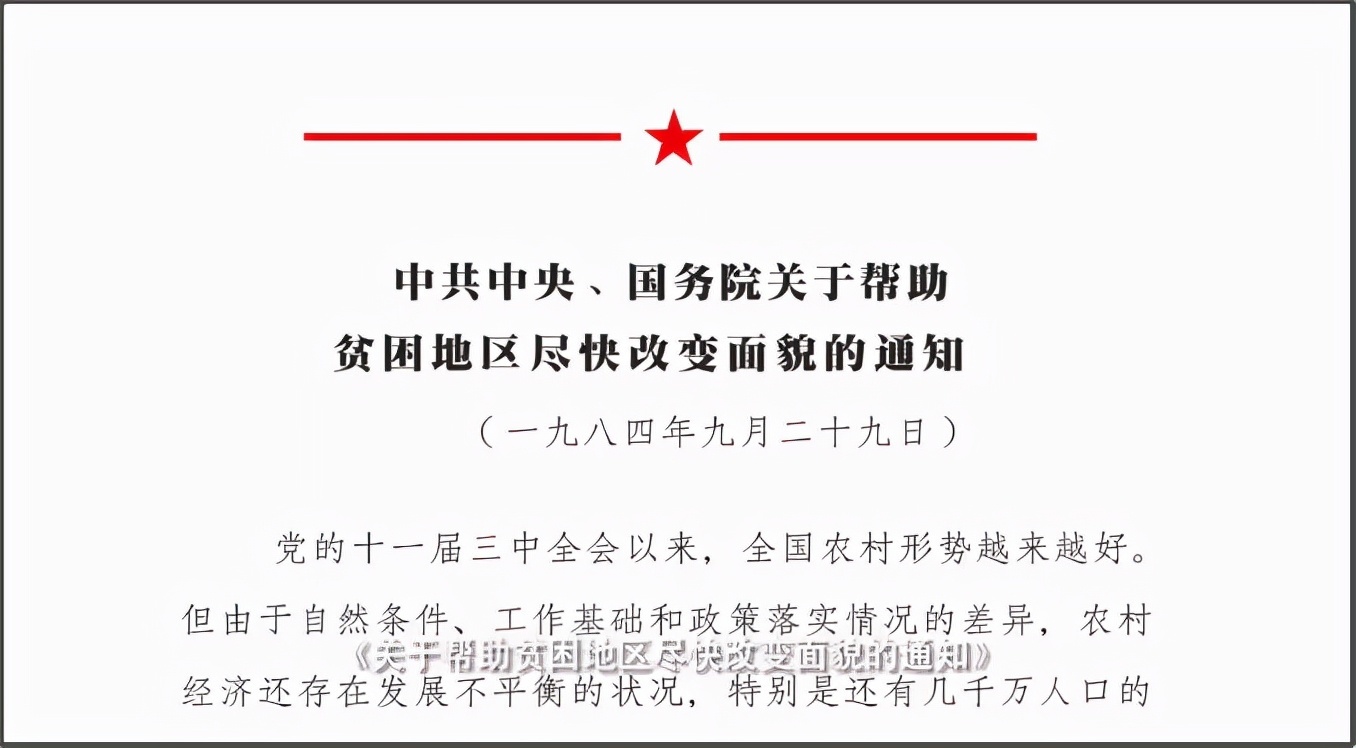 于是,1984年9月29日,中共中央、国务院发出《关于帮助贫困地区尽快改变面貌的通知》,一场以转变思想观念为突破口的全国性的扶贫攻坚工作,由此拉开序幕。