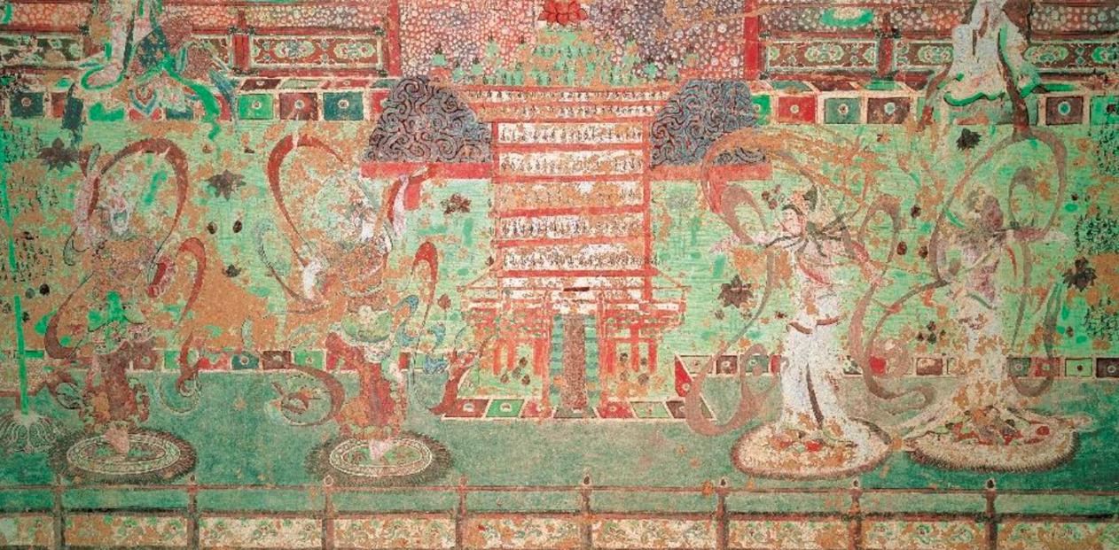 1944年,前敦煌艺术研究所在敦煌第220窟脱落的壁画下,剥离出宏大瑰丽的初唐壁画,其主室北璧绘有《东方药师经变画》,其中有着敦煌莫高窟中极具代表性的乐舞图形。绘乐师共有二十八人分坐两侧,中间有舞伎四人(敦煌经变画中仅此一处为四人,其余均为独舞或双人舞),舞伎的排列分为左右两组(二人为一组)。东侧即右组二舞伎,上身赤裸,臂有钏,腕有镯,头上戴杂宝花冠,发绺飘散,身饰璎珞,披丈余长巾,穿月白长裙,赤足,各立于一小圆毯子上起舞,这种独舞方式,不少学者称之为“胡旋”。