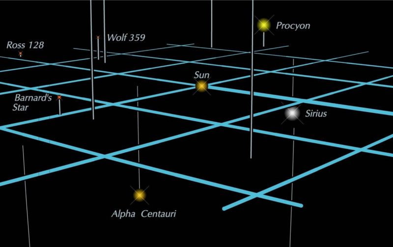 |距离太阳12光年以内的恒星。网格上的线相隔4光年,比邻星是三星系统的一部分,我们看到的是单星半人马座α星。图片最初发表于Guy Ottewell's