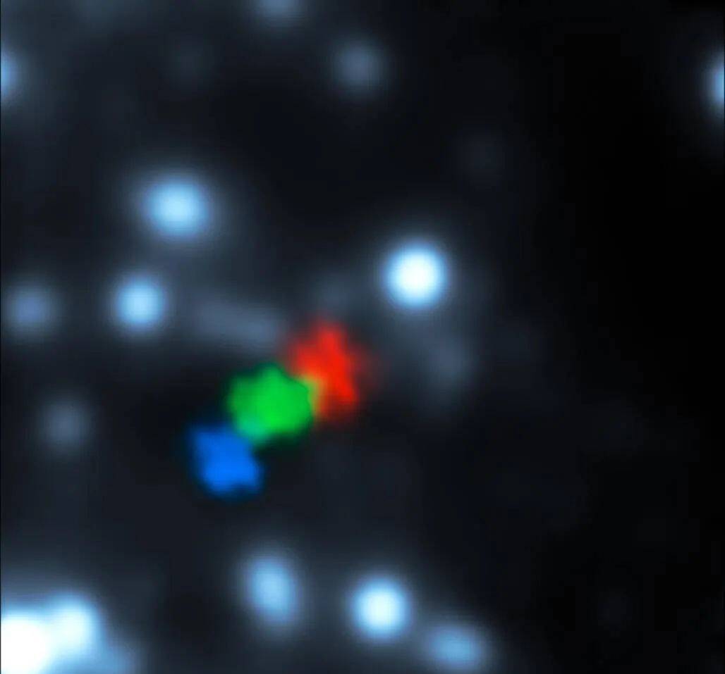 被银河中心黑洞扯碎的气体云(2006年、2010年和2013年的观测结果分别以蓝色、绿色和红色表示)(图源:wiki)