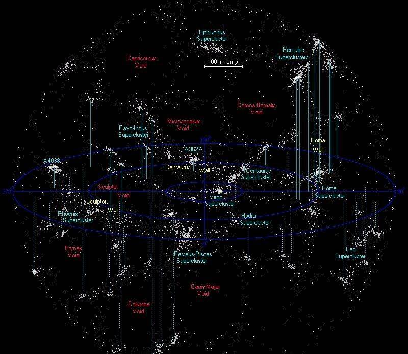 五亿光年内最近的超星系团的地图。拉尼亚凯亚在红色的圈圈中(图源:wiki)