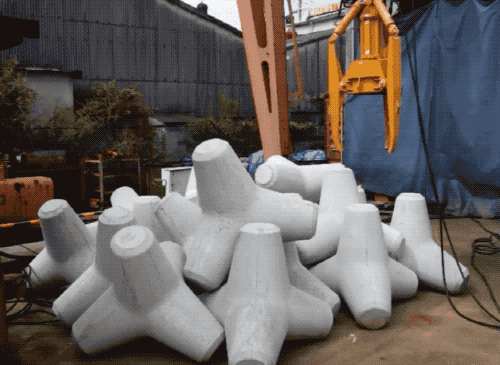 这种水泥块一般就在堤坝外围摆放着,作用是去吸收或减弱海浪拍打过来的冲击力,从而保护海岸。统称叫做“消波块”,英文检索的关键词有俩 tetrapod 和 dolos 。除了下图中间这种四个顶角朝外延伸的比较难猜制作过程,其他的,感觉大家看了这么久“有趣的制造”,大概不难想到怎么做水泥浇筑了...😅