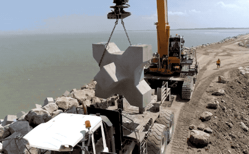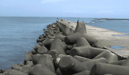 这些大型的水泥墩,当然不会是一股脑儿的往堤坝边倒下去,否则会有磕碰损伤...确实是一个个放下去,但是!并不需要一定按照什么规则码放。反正就是为了相互戳在一起,让大家伙儿一起减少海浪的侵袭...乱堆也可以叫做“自然堆砌”...教科书上真是这么写的。😅