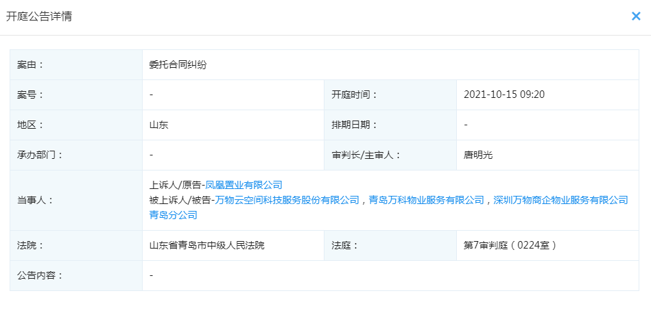 乐居买房讯 据企查查,近日,凤凰置业有限公司对万物云空间科技服务股份有限公司、青岛万科物业服务有限公司、深圳万物商企物业服务有限公司青岛分公司进行上诉,案由因委托合同纠纷,开庭日期2021-10-15 09:20,在山东省青岛市中级人民法院第7审判庭(0224室)开庭。