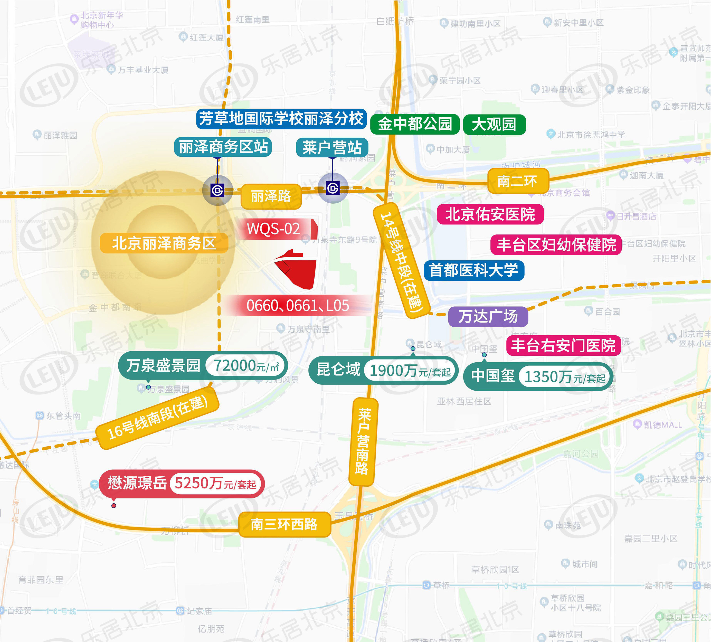 地块靠近西二环,周边有16号线一期、14号线两条地铁线路在建,东侧直线距离约500米为菜户营南路,具体位置信息如下: