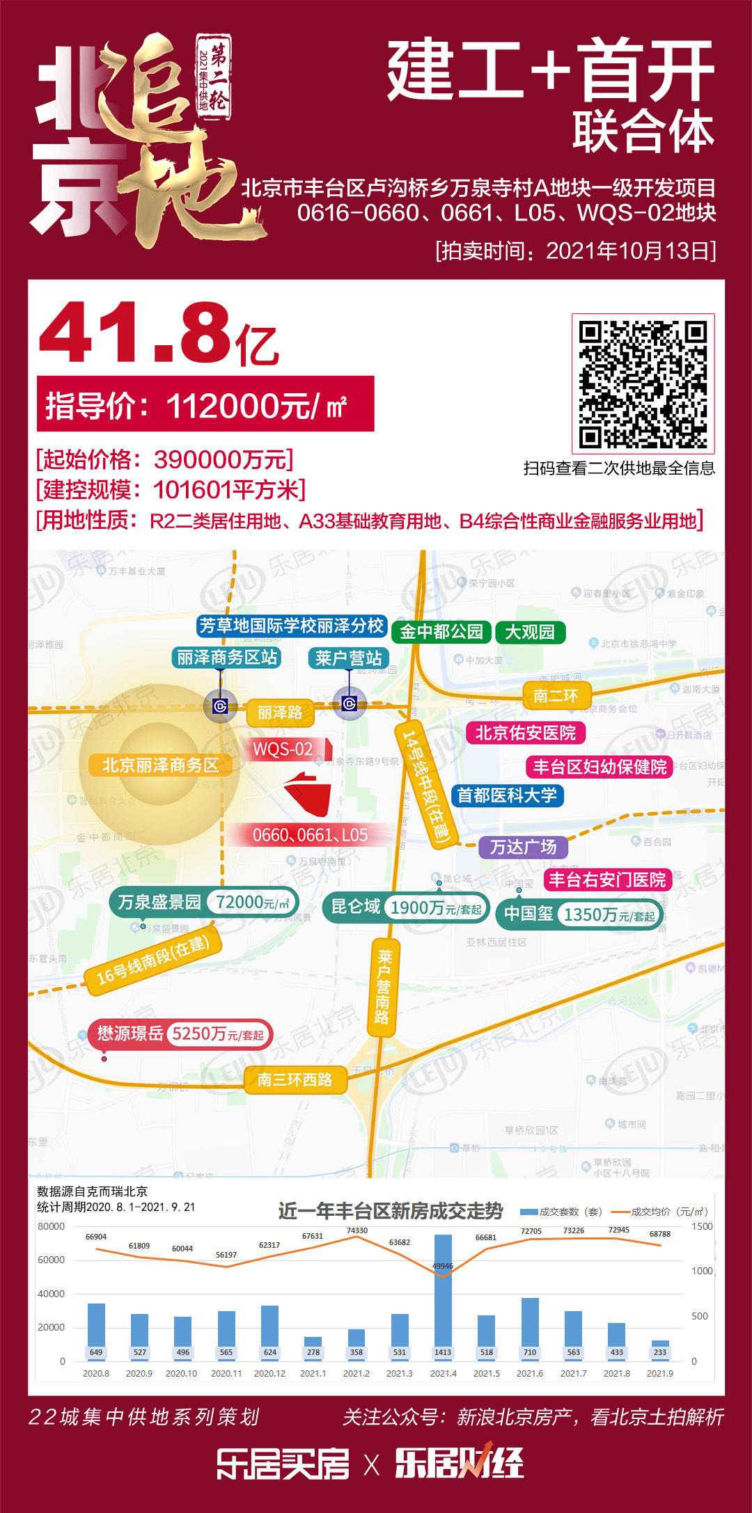 乐居买房讯 编辑:孙晓萌 北京第二批集中供地现场竞价正在进行中!10月13日下午,丰台区卢沟桥乡万泉寺村A地块一级开发项目0616-0660、0661、L05、WQS-02地块举行现场竞价,该宗地吸引了中海、懋源、华润、建工+首开,共4家房企及联合体报名参与,起拍价为39亿元,起始楼面价约3.8万元/㎡。经过11轮的竞争,最终建工+首开联合体以41.8亿竞得,可售住宅楼面价约7万元/㎡,溢价率7.18%。