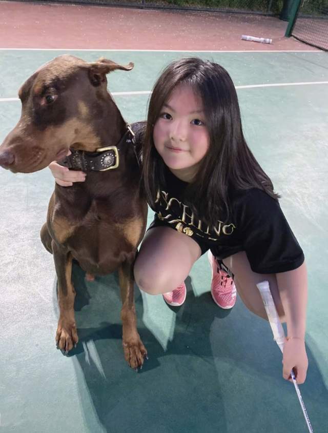 照片中,王诗龄长发披肩十分淑女,五官精致小脸红润,明显能看出她瘦了许多,不再像之前那样圆润了。她穿着一件黑色T恤搭配黑色短裤,蹲在球场上拍照,左手拿着球拍,右手搂着一只大狗,甜美可爱。