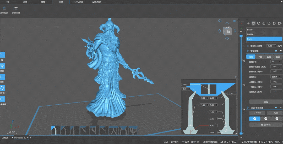 当您拥有多个支撑配置文件时,您可以通过Tab快捷键快速切换不同的支撑配置文件。通过支撑预览图,您可以直观看到常规支撑参数设置的变化效果,并可实时应用选定的支撑配置参数添加支撑。