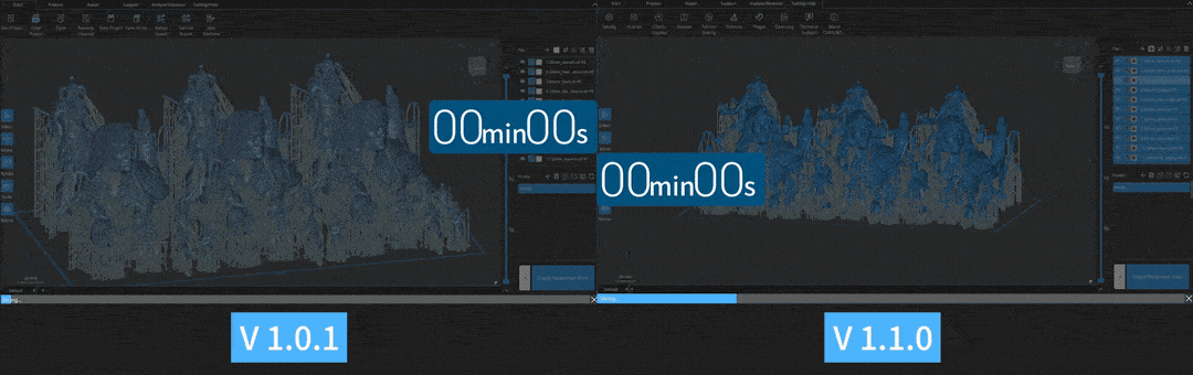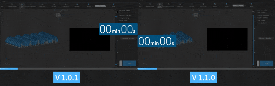 相较以前所有版本的孤岛检测速度,CHITUBOX Pro V1.1.0带来了数倍的速度提升,可以更加快捷高效地辅助您完成孤岛的检测。由于很多用户在检测切片时,会多次使用孤岛检测功能,因而新版本带来的检测速度提升,将在实际使用中带来显著的效率提升。