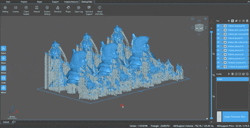 随着LCD 3D打印机尺寸越来越大,打印机屏幕显示分辨率接连突破6K,8K,所有一切的提升都对软件提出了更高的要求,在模型数据和支撑数据大量增加的情况下,CHITUBOX Pro V1.1.0相较以往所有版本,拥有完全不一样的流畅使用体验,在文件的三角面片数量超过1亿时,还能正常使用,为您的打印机提供更强助力。