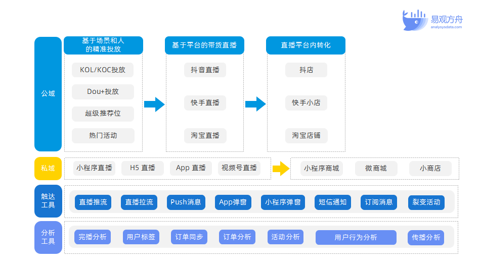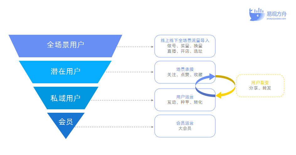 从直播链接引流到注册、下单的转化分析,需要不断优化改进用户消费流程;小量级的不同主播A/B测试,也可以找到更强实力的带货主播;最终平台内的用户还是需要实现细分层、自转化和自升级,利用裂变分销的工具,通过老带新和交叉营销的方式,实现用户贡献的增值。