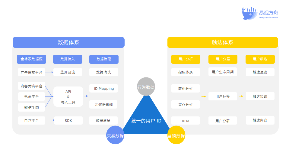 对于很多的企业和品牌主来说,并不需要引入一个大的数据中台,而是可以灵活快速的搭建一个自有的私域用户运营的平台,能够汇聚主流用户流入的场景数据源,轻量级的解决数据接入和数据治理的问题,实时的掌握多端的用户数据,并形成唯一识别;另一方面可以将用户的数据和触达的通道拉通,实现从用户分析、用户分层和用户触达的三部曲。