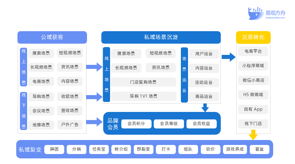 目前,线下的获客主要集中在门店的导购场景、地推场景和户外广告等,线上的公域获客场景主要集中在搜索引擎,短视频、长视频、资讯、内容社区和电商等,其中电商和视频直播又相融交叉,资讯和社群的边界感也越来越淡。