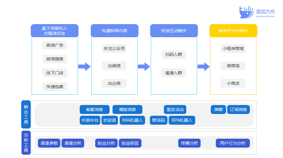 在用户的分析工具上,除了常规的渠道分析模型和行为分析等,我们还可以关注粉丝的标签;在触达的工具上,我们要善于利用微信生态的现成工具。