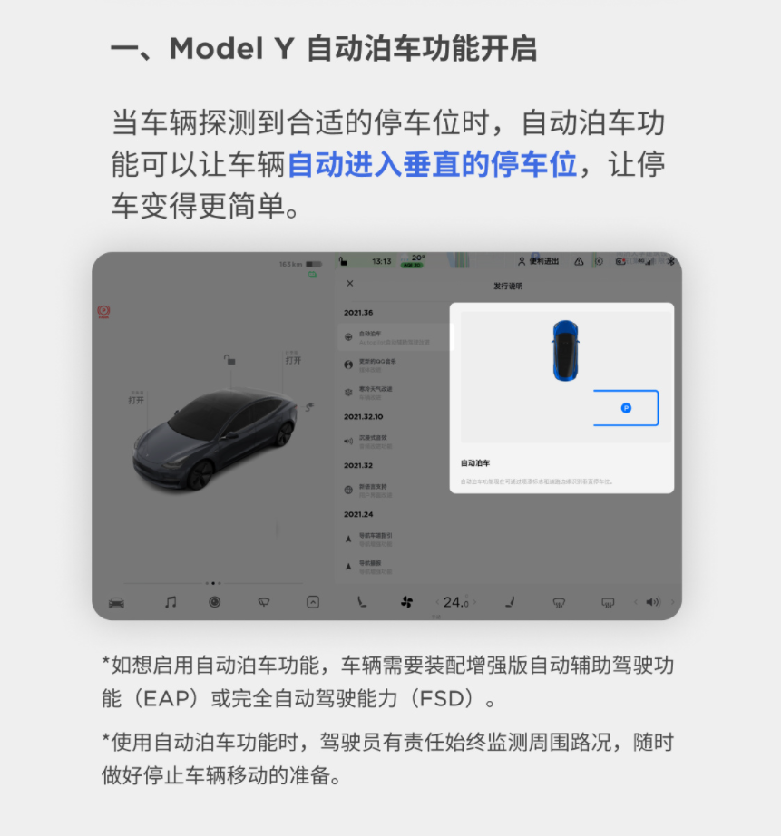 自动泊车功能开启后,当车辆探测到合适的停车位时,车辆将自动进入垂直的停车位。该功能需要配合 EAP 或 FSD 使用。