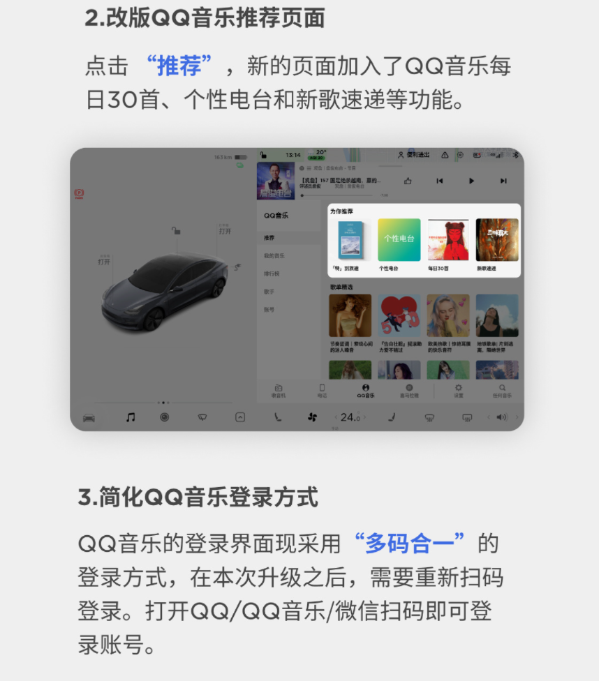 QQ 音乐的推荐页面也进行了改版,添加了每日 30 首、个性电台、新歌速递等功能。QQ 音乐的登录方式改为了“多码合一”,用户在升级后需要重新扫码登录 QQ 音乐。