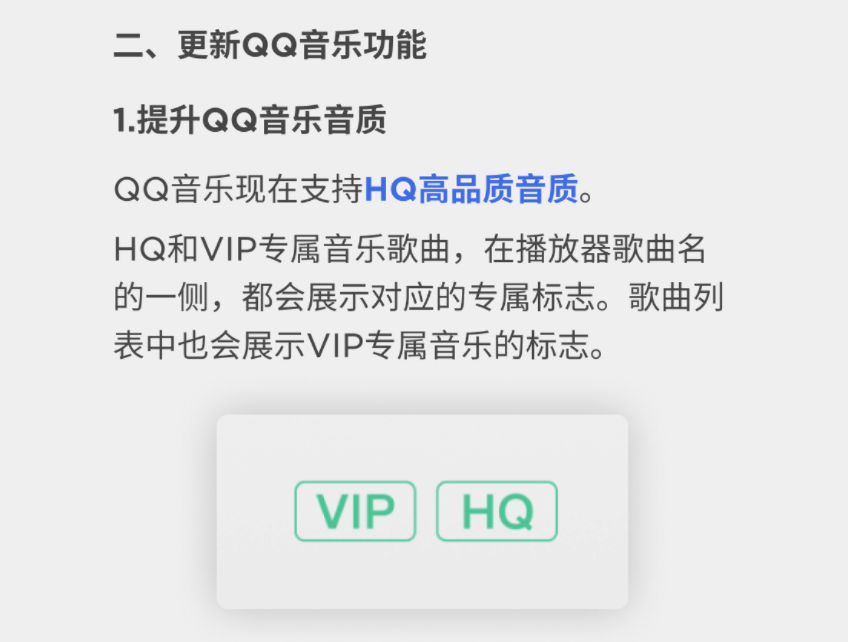 此外,本次更新为 QQ 音乐带来了 HQ 高品质音质,在播放器歌曲名一侧,会展示对应的 HQ 和 VIP 专属标志。