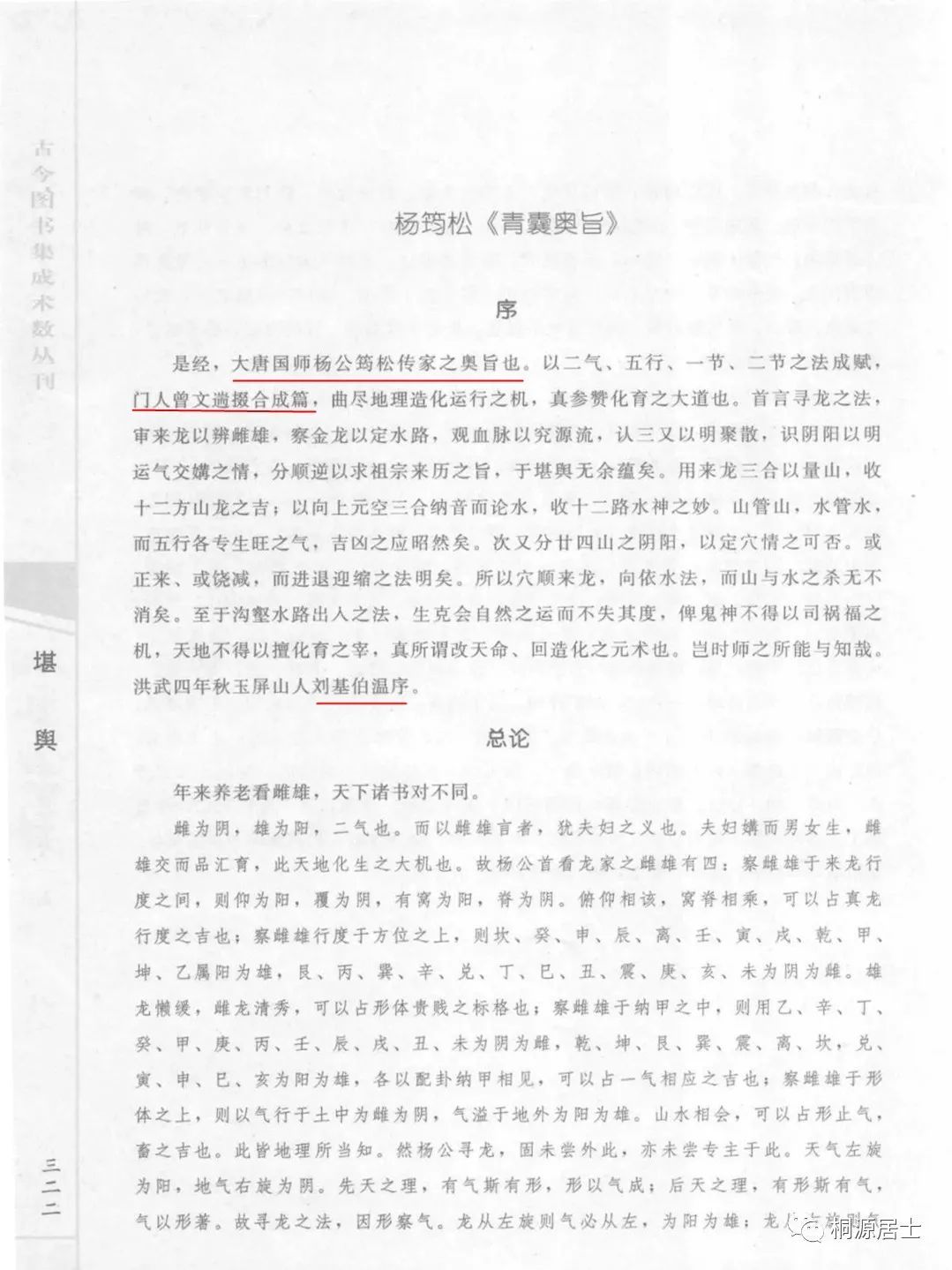 因其盛名,明清风水界托名刘基的伪作纷纷出世,刘基亦被冠以杨公风水传承人的名号。其中,《古今图书集成》辑“杨筠松《青囊奥旨》”,附有刘伯温写的序,序中言《青囊奥旨》为杨筠松“传家之奥旨”,由“门人曾文遄撰合成篇”。